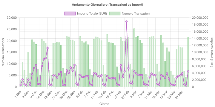 We analyzed 1,331,545 transactions between January 1 and March 30, 2026, for a total value of €264,617,039.66. For most of the period, the system behaves as expected: fairly stable daily volumes, a few million euros per day, no significant deviations.